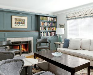 We kept the existing gas fireplace and the tile around it and new deep teal built-ins and decorative moldings above the mantel made a very attractive focal point of the room.