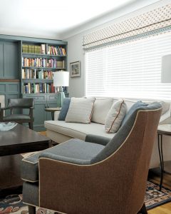 Further, the piano found a new home in another room and freed up precious space for traffic. Introducing a large sofa with swivel chairs on the opposite side, two pull up chairs in front of the fireplace and a gorgeous two-tone chair for the head of the family allowed us to create a very comfortable seating arrangement. Next, a custom-built grandchildren’s friendly coffee table extending to the width of the sofa offered a reachable surface for people around it.