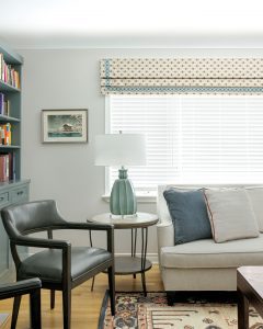 Colour palette was inspired by the painting above the fireplace, a favourite of the family, with teal, rust and blue details. To improve the lighting, a bright flush mount light with a geometric grid replaced the old fan.