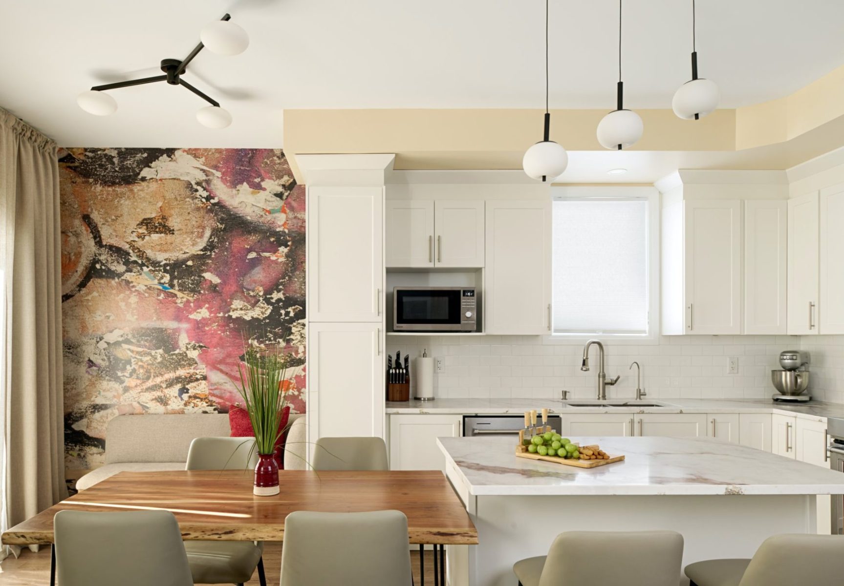 The dining area, positioned beside the patio doors, was treated as a moment of artistic expression within the everyday. A custom abstract mural introduces colour, movement, and a sense of playfulness, transforming the breakfast zone into a vibrant focal point that feels both uplifting and personal.
