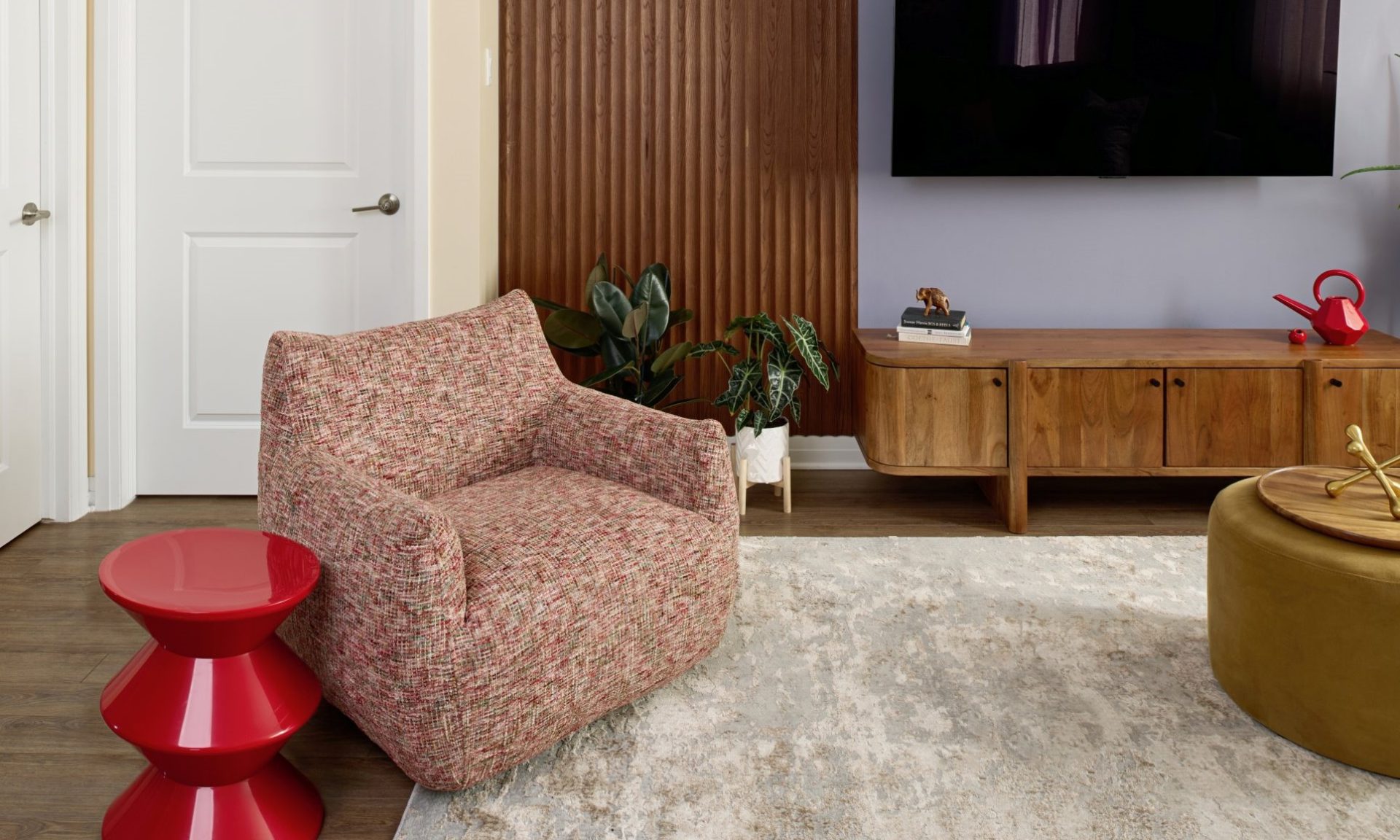 A defining feature of the space is a commissioned painting by a local artist—a red abstract, organically imperfect textural arch. Bold yet fluid, it anchors the room visually while echoing the warmth and energy of the overall palette. More than decor, it brings a sense of individuality and artistry that makes the space feel truly one of a kind.